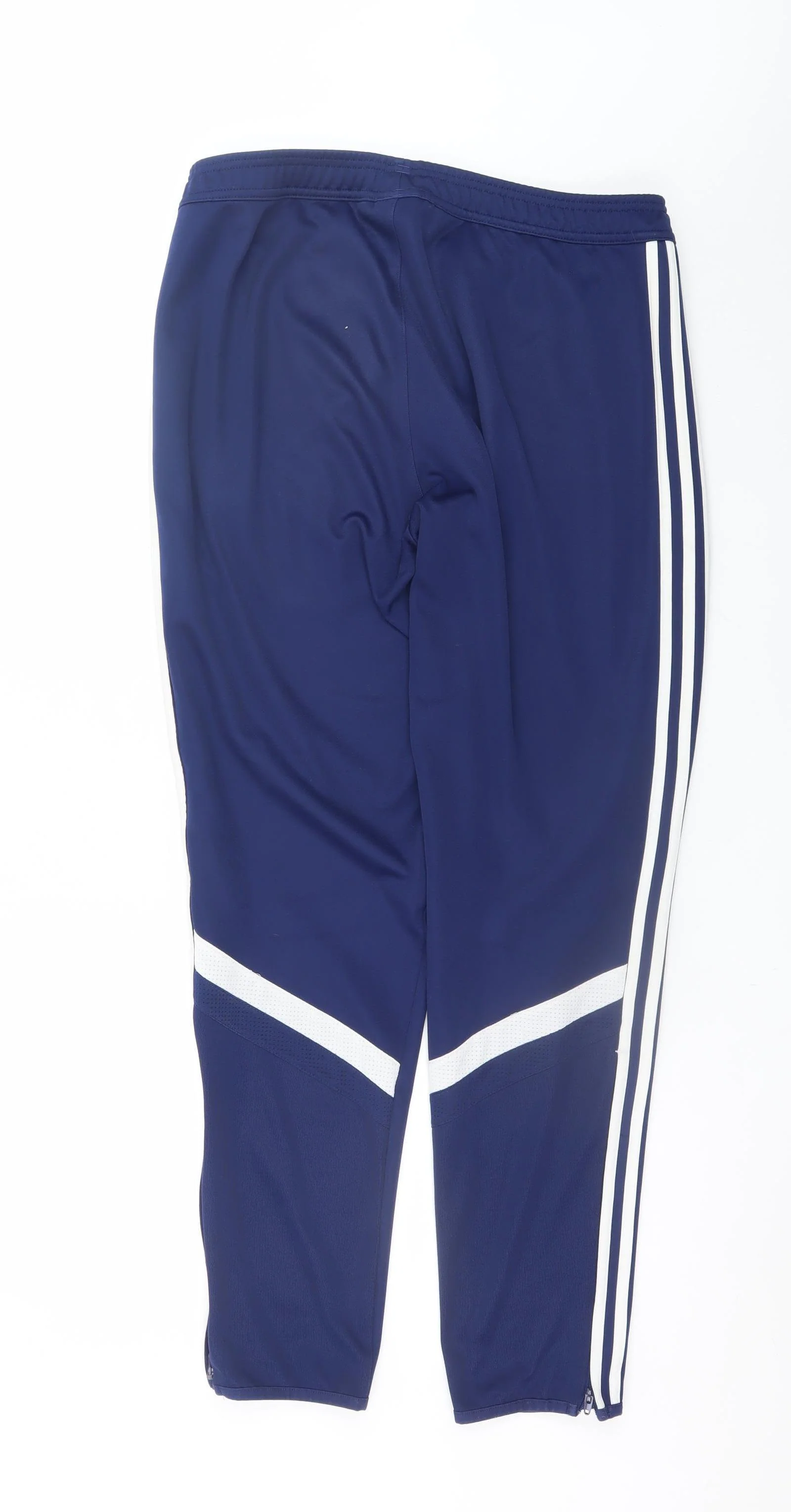 These Adidas men's blue jogger trousers combine comfort, performance, and contemporary style. Cut in a slim, tapered fit, they provide a sleek silhouette ideal for athletic or casual wear. Made from 100% polyester fabric, the lightweight and breathable material promotes ventilation and ensures moisture-wicking performance to keep you comfortable during workouts, travel, or relaxed days. The joggers feature an elasticated waistband with an adjustable drawstring for a secure fit and zippered side pockets for safe storage of essentials. The signature Adidas three-stripe detailing down the sides and logo accent on the front make them instantly recognisable and sporty. The quick-dry jersey fabric allows ease of movement while maintaining a neat, refined look that transitions from gym sessions to casual outings effortlessly. Designed with practical features such as stretch comfort, ankle zips, and a flat front structure, these trousers offer both function and versatility. Suitable for spring through winter, they are perfect for layering or solo wear. Despite light wear, the trousers remain in excellent condition, showing minimal signs of previous use and ready for more adventures. Easy to care for and machine washable, these Adidas joggers are a reliable addition to any men's activewear collection. Whether paired with a hoodie for workout sessions or a casual tee for weekend wear, they maintain the balance between style and performance that Adidas is known for. A must-have for those who appreciate quality and iconic design.