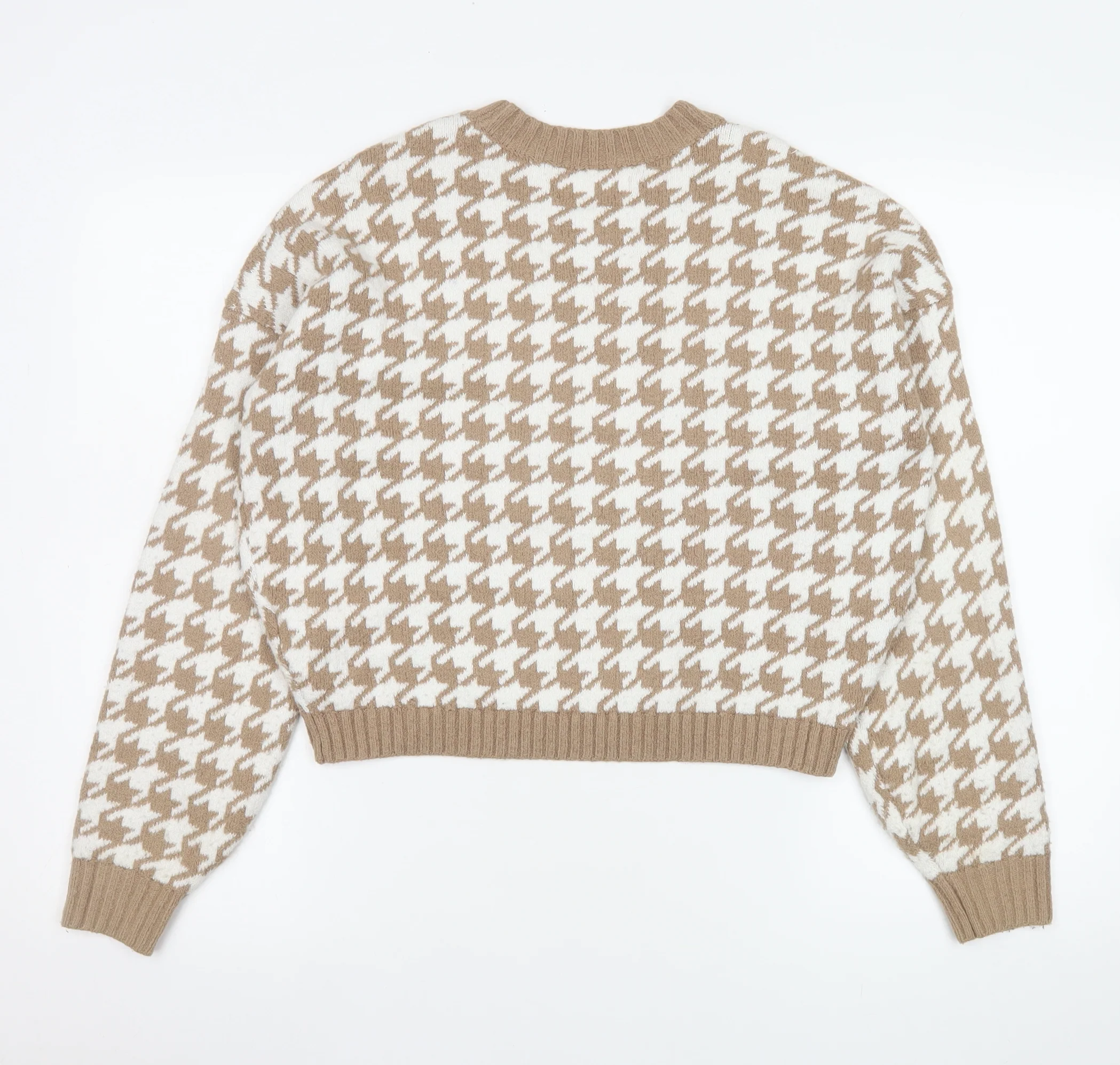 Hollister Womens Beige Houndstooth Knit Jumper XS Crew Neck Pullover—