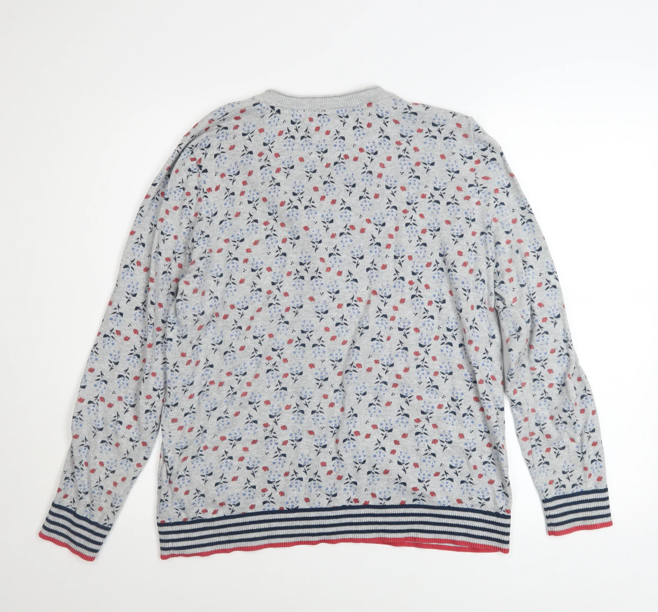 Add a touch of comfortable charm to your wardrobe with this Mantaray Women’s Grey Floral Cardigan. Crafted from 100% cotton, this lightweight knit offers an easy, breathable feel that’s ideal for layering through spring and autumn. The design features a subtle all-over floral print in soft shades of navy, red, and pale blue, giving it a fresh, cheerful appearance perfect for casual days or relaxed evenings. A crew neckline and button front closure complete the classic cardigan silhouette, while striped trims on the hem and cuffs introduce a playful nautical twist reflecting Mantaray’s signature seaside-inspired style. This cardigan comes in a UK size 16 and offers a regular, comfortable fit suitable for layering over tees, blouses, or dresses. The cotton fabric ensures comfort and easy care — machine washable and designed for everyday wear. The piece is finished with red contrast piping along the front placket for a subtle pop of colour, enhancing its unique design appeal. A dependable classic, this knit combines softness, breathability, and charm, making it an easy choice for women seeking effortless, laid-back fashion. The condition of this garment is excellent, showing only light signs of previous wear with no visible stains, holes, or damage, maintaining its high-quality look and integrity. Perfect for casual occasions, day outings, or layering in transitional weather, it can easily complement jeans, skirts, or chinos for an effortlessly stylish outfit. This Mantaray cardigan provides both comfort and personality, staying true to the brand’s relaxed, nature-inspired aesthetic. A versatile piece to wear across seasons, it’s a must-have addition for anyone who values classic comfort with a feminine twist.