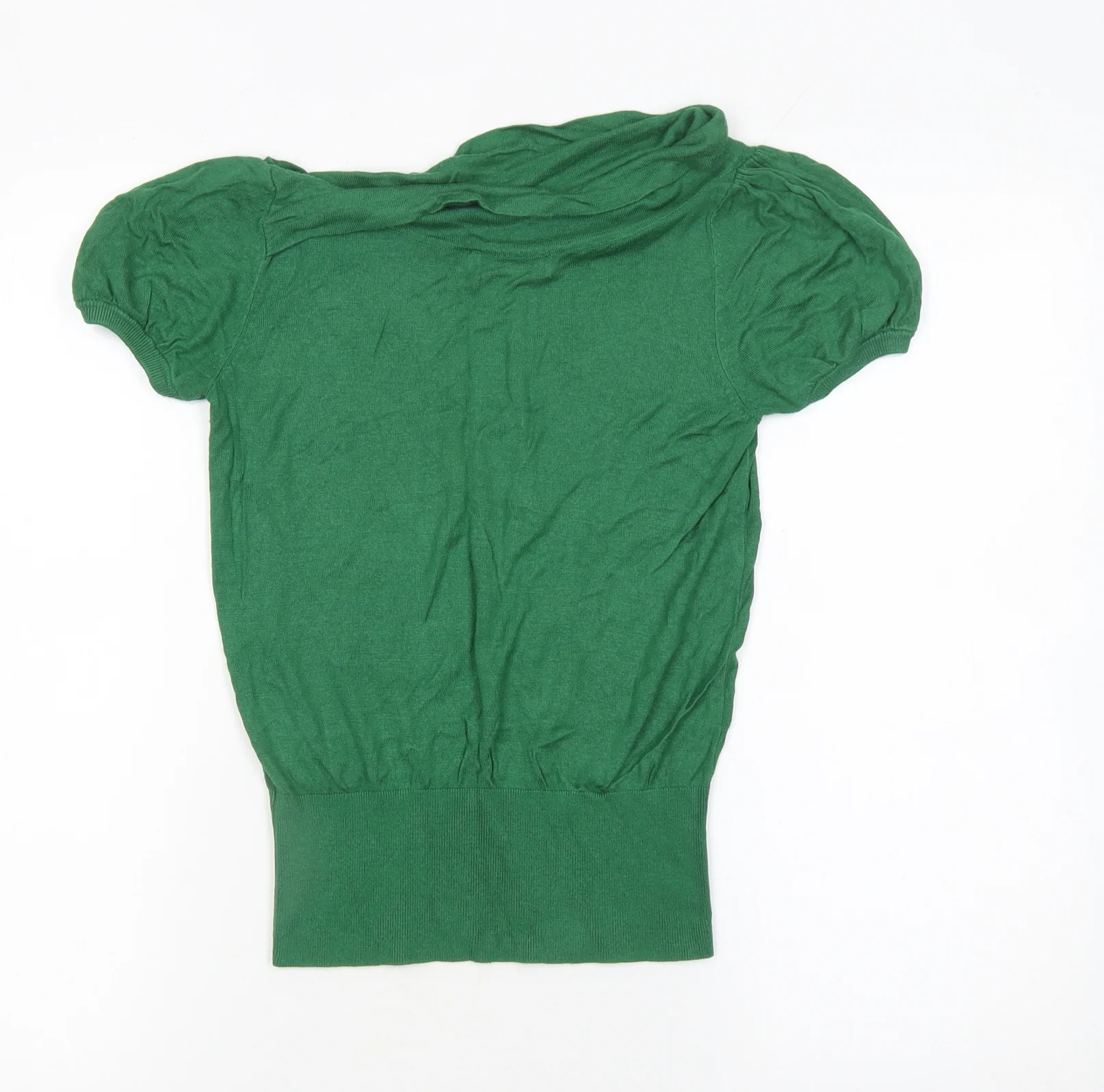 Add a pop of colour to your wardrobe with this stylish Topshop Women’s Green Pullover Jumper. Designed with a flattering cowl neckline and charming puff short sleeves, this piece perfectly combines comfort with effortless chic. Made from a soft, breathable blend of viscose, polyamide, and elastane, the jumper offers a lightweight feel with just the right amount of stretch for a comfortable fit. The tight-knit finish gives it a smooth, refined appearance that drapes beautifully on the body. This versatile piece can be worn casually with jeans or paired with a skirt for a more polished ensemble, making it a great addition to your everyday style rotation. Ideal for transitional weather, it’s perfect for spring and autumn layering under a jacket or over a crisp shirt. This knit is in excellent pre-loved condition, showing only light wear and minor creasing from handling. Its rich green colour adds freshness to any outfit, while the ribbed hem ensures a flattering silhouette. Feminine yet contemporary, this jumper is easy to style and care for, as it’s conveniently machine washable. Whether you’re dressing for a relaxing weekend, a casual day out, or a cosy office look, this Topshop jumper makes a subtle but confident fashion statement. Ready to become one of your go-to favourites, it strikes the perfect balance between casual comfort and refined elegance.